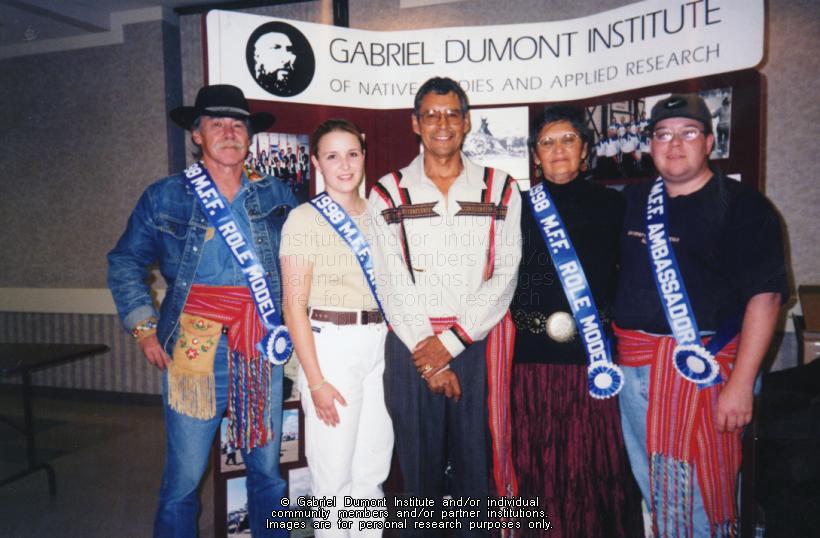 Photograph of the role models and ambassadors for the 1998 Prince Albert Métis Fall Festival. Left to right: Joe Welsh, Christine Wright, Fall Festival President, Louis Dorion, Maria Campbell and Kurtis Hamel. |