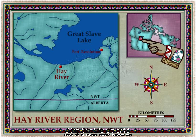 | Description: | This map locates Hay River, a Métis community in the Northwest Territories. The map was originally produced by the Gabriel Dumont Institute for the CD-ROM, "The Metis: Our People, Our Story". |
