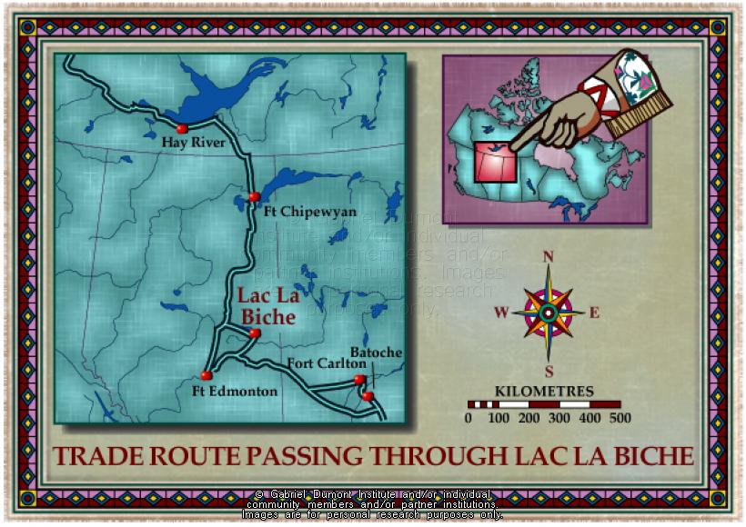 This map illustrates the fur trade transportation route that passed through Lac La Biche in the nineteenth century. The map was originally produced by the Gabriel Dumont Institute for the CD-ROM, "The Metis: Our People, Our Story". |