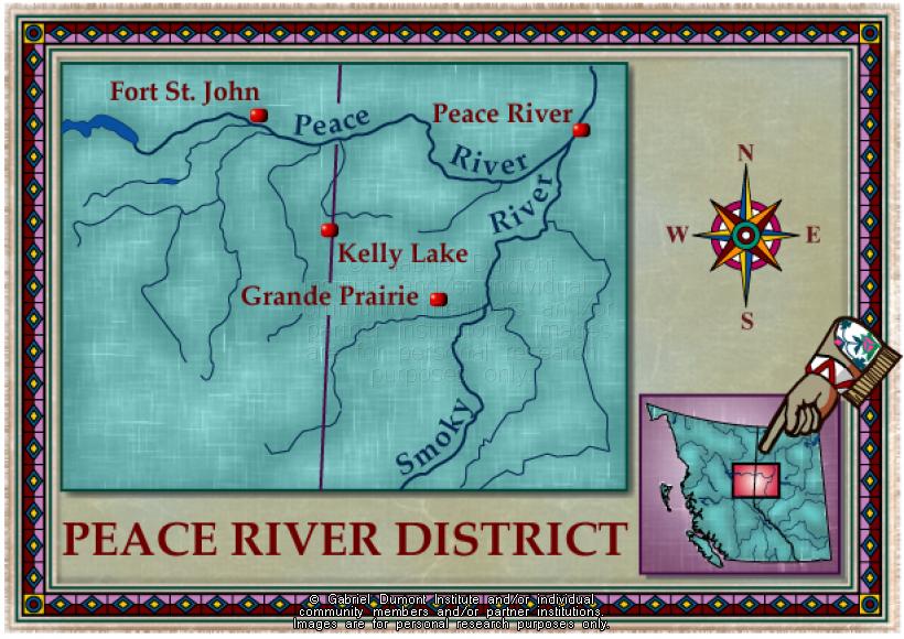 Description: This map is of the Peace River District of Alberta and British Columbia, where many Métis ended up after the 1885 Resistance. The map was originally produced by the Gabriel Dumont Institute for the CD-ROM, "The Metis: Our People, Our Story".
