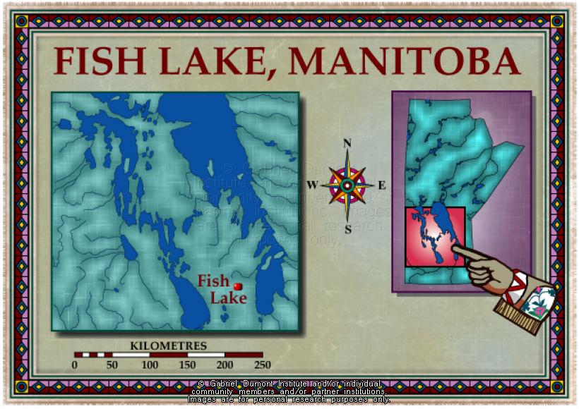 | Description: | This map indicates the position of Fish Lake, Manitoba, a Métis community in the Interlake" Region. The map was originally produced by the Gabriel Dumont Institute for the CD-ROM, "The Metis: Our People, Our Story".