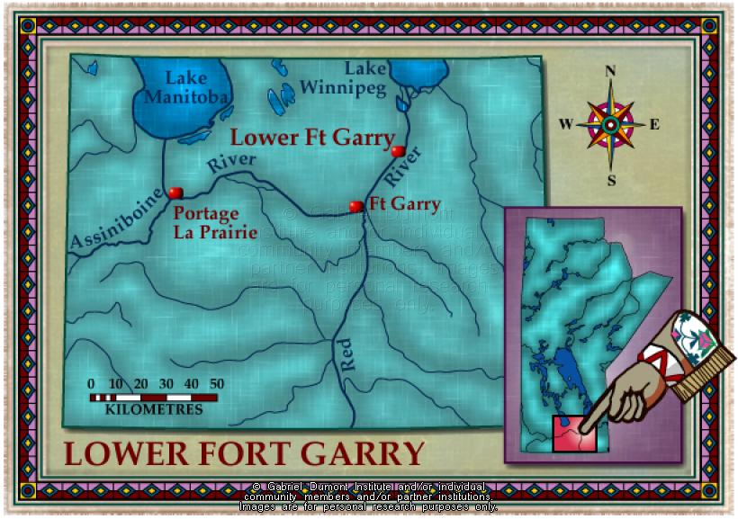 This map delineates the local of Lower Fort Garry -- a pivotal locale in the Red River Resistance. The map was originally produced by the Gabriel Dumont Institute for the CD-ROM, "The Metis: Our People, Our Story". |