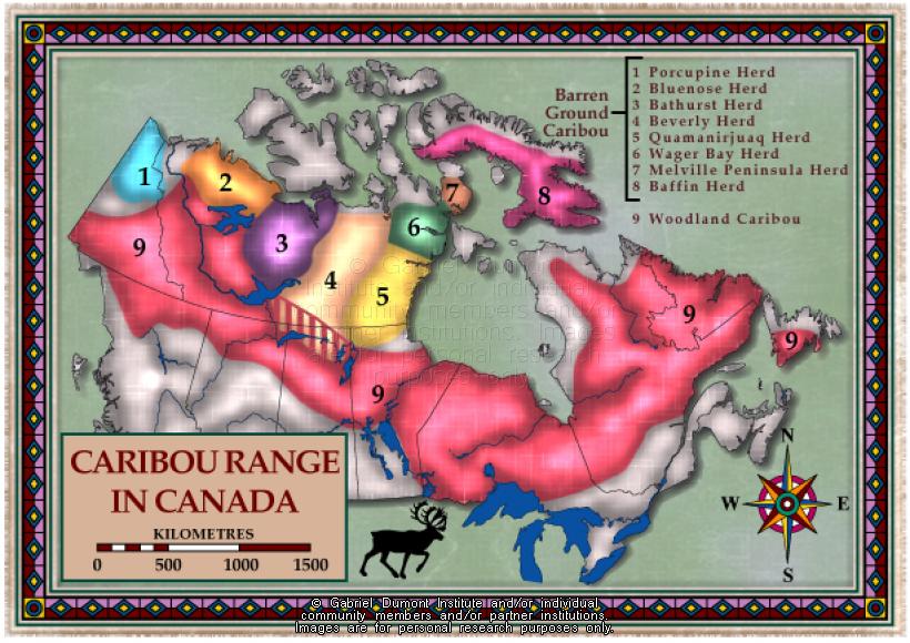 This map outlines the location of caribou across Canada. The map was originally produced by the Gabriel Dumont Institute for the CD-ROM, "The Metis: Our People, Our Story". |