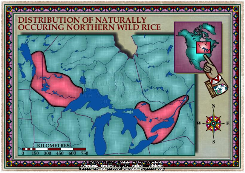 This map illustrates where naturally occuring Northen Wild Rice grows in North America. The map was originally produced by the Gabriel Dumont Institute for the CD-ROM, "The Metis: Our People, Our Story". |