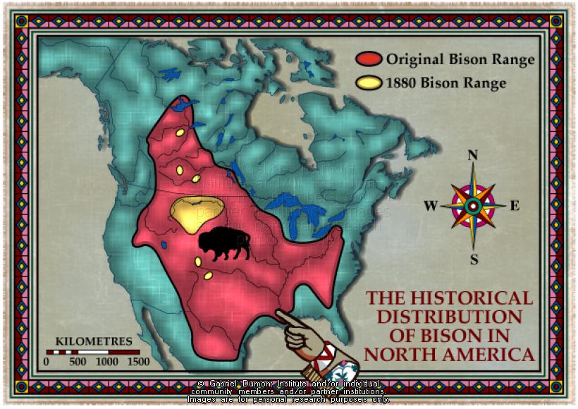This map illustrates the original distribution of bison before their near extermination in the nineteenth century. The map was originally produced by the Gabriel Dumont Institute for the CD-ROM, "The Metis: Our People, Our Story". |