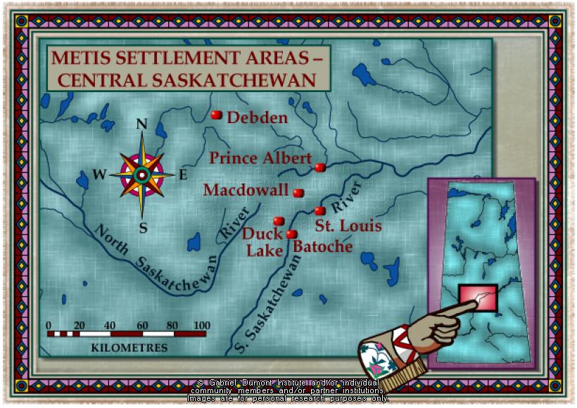 This map illustrates the distribution of settlement for the Métis in central Saskatchewan. The map was originally produced by the Gabriel Dumont Institute for the CD-ROM, "The Metis: Our People, Our Story". |