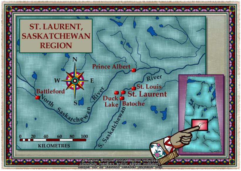 This is a map of St. Laurent, Saskatchewan an historic Métis community and the place where the Métis, under the leadership of Gabriel Dumont, established a shortly lived self-governing council. The Northwest Mounted Police ended the experiment in self-government in 1873 after the local Métis tried to enforce a bylaw preventing people from abusing the depleting bison resource. The map was originally produced by the Gabriel Dumont Institute for the CD-ROM, "The Metis: Our People, Our Story". |