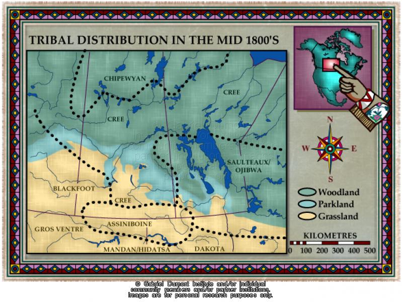 This map illustrates the various First Nations groupings in the Prairie West, prior to the region's entry in Canada. The map was originally produced by the Gabriel Dumont Institute for the CD-ROM, "The Metis: Our People, Our Story". |