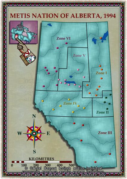 This map outlines the political structure of the Métis Nation of Alberta. The map was originally produced by the Gabriel Dumont Institute for the CD-ROM, "The Metis: Our People, Our Story". |
