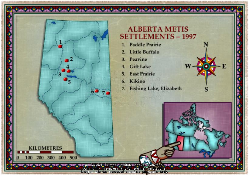 Description: This map includes all the Alberta Métis Settlements as the existed in 1997. This map includes all the Alberta Métis Settlements as the existed in 1997. The map was originally produced by the Gabriel Dumont Institute for the CD-ROM, "The Metis: Our People, Our Story".