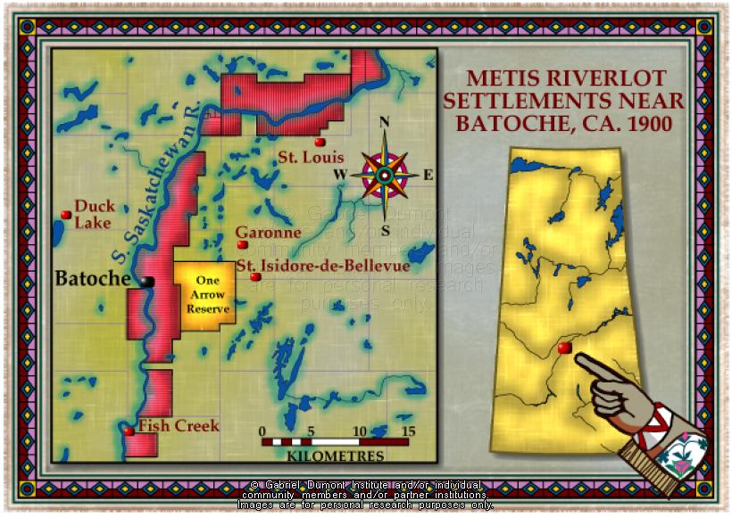 This map illustrates the Métis riverlot land tenure system around Batoche (in what is now Saskatchewan) in 1900. The map was originally produced by the Gabriel Dumont Institute for the CD-ROM, "The Metis: Our People, Our Story". |