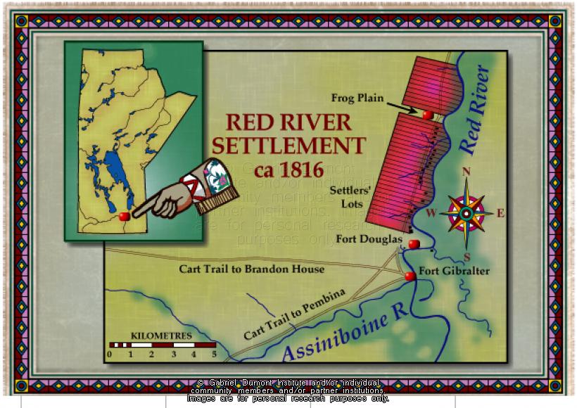 This map details the extent of settlement in the Red River region at the time of the (June 19, 1816) Battle of Seven Oaks. The map was originally produced by the Gabriel Dumont Institute for the CD-ROM, "The Metis: Our People, Our Story". |