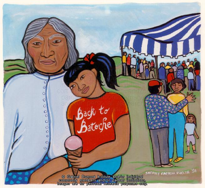 Illustration, of two generations of Métis women at Batoche, by Sherry Farrell Racette for her book "The Flower Beadwork People". |
