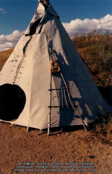 | Description: | Photograph of a tipi and a travois at Wanuskewin Heritage Park. |