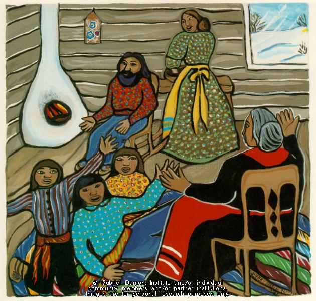 Illustration, of a grandmother telling stories to children, by Sherry Farrell Racette for her book "The Flower Beadwork People". |