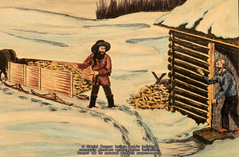 Description: Illustration of Gabriel Dumont leaving firewood for a family from "Gabriel Dumont: Métis Legend".