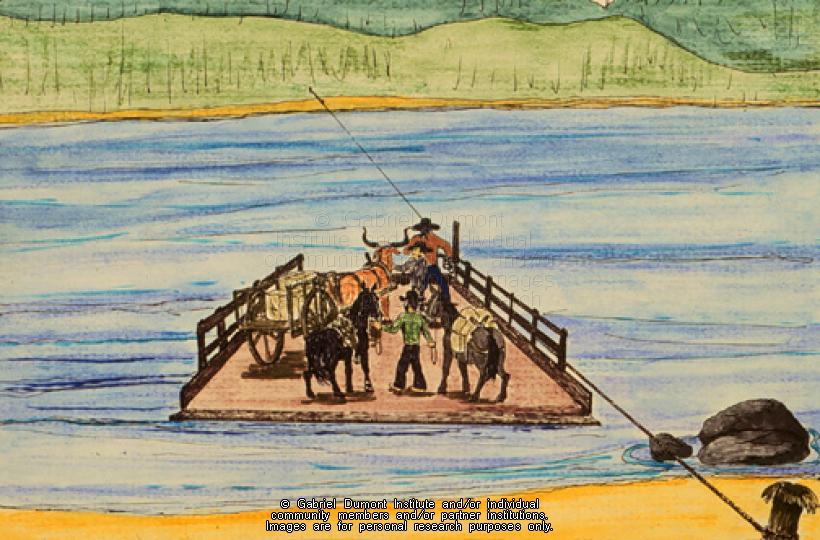 | Description: | Illustration of a ferry crossing a river from "Gabriel Dumont: Métis Legend". |