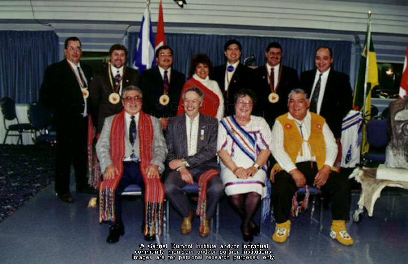 Photograph of the Métis National Council Cabinet taken in the mid-1990s at the ceremony to swear in the cabinet members in Regina. The cabinet members (in no particular order) are: Gerald Morin, Ron Swain, Gerald Thom, Norman Evans, Ernie Blais, Gary Bohnet, and Sheila Genaille. Also helping at the ceremony are (front row, left to right) Father Guy Lavallee, Senator John Boucher, Senator Thelma Chalifoux and Senator Ed Head. |
