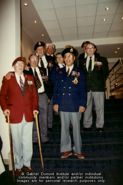 Photograph of Alberta Métis War veterans. (Left to right: man in red coat, unknown; man in blue coat with no cap, unknown; man in blue coat and cap, Hugh Victor (Vic) Letendre; man with blue coat and cap, Robert Berard; behind him, Bertha Clark-Jones, and beside her Oscar Lacombe, and George Pambrun. Information provided by Murleen Veronica Letendre Crossen.