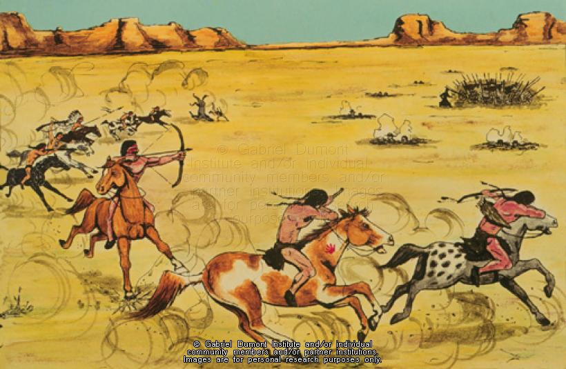 | Description: | Illustration of Métis defending themselves from Dakota Sioux attack at the Battle of Grand Coteau, 1851 from "Gabriel Dumont: Métis Legend". |