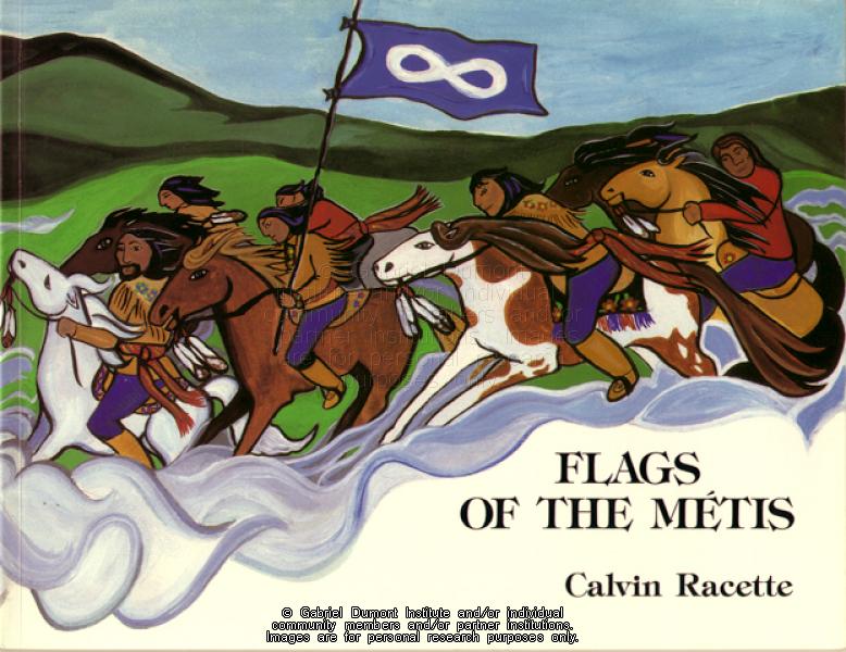 Illustration, of Métis men with flag on horses going to the Battle of Seven Oaks, by Sherry Farrell Racette for the book "Flags of the Métis" by Calvin Racette. |