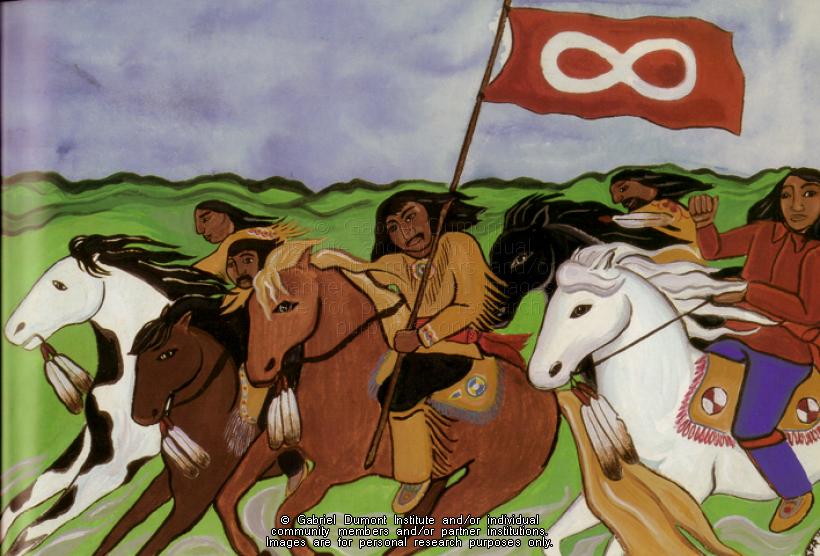 Illustration, of Métis men on horses with flag given to them by the North West Company, by Sherry Farrell Racette for the book "Flags of the Métis" by Calvin Racette. |