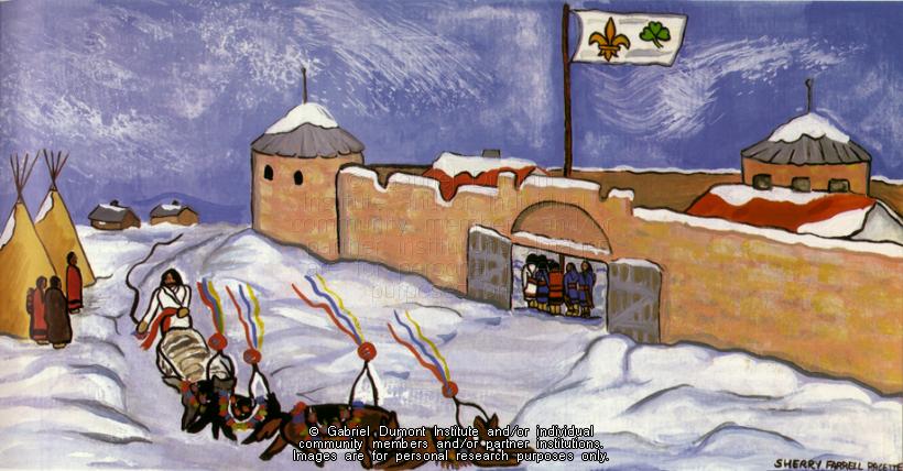 Illustration -- of Fort Garry, occupied by the Métis in 1869 with the new Métis flag raised by the Provisional Government -- by Sherry Farrell Racette for the book "Flags of the Métis" by Calvin Racette. |