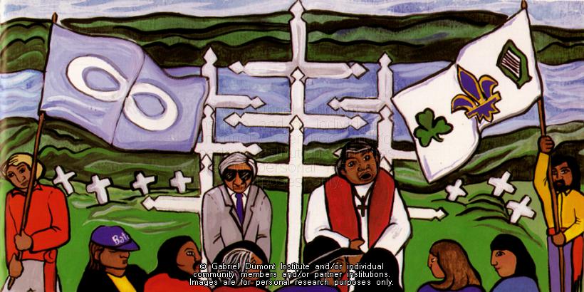 Illustration, of people gather to celebrate mass at the cemetery in Batoche, by Sherry Farrell Racette for the book "Flags of the Métis" by Calvin Racette. |