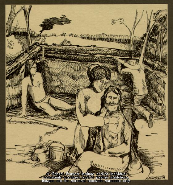 | Description: | Illustration of Madeleine Dumont caring for a wounded Métis soldier in the rifle pits. |