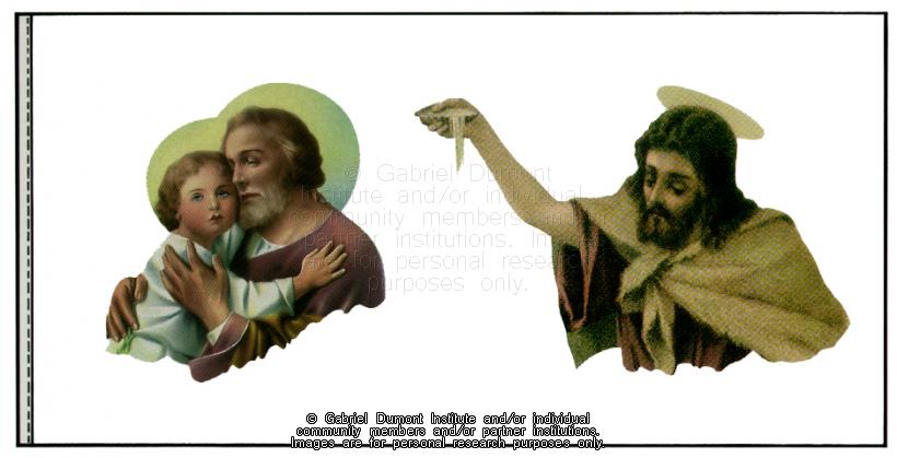Illustration, of the banner of the Association of St. Joseph (depicting St. Joseph and infant Jesus and St. John the Baptist), by Charles Belhumer for the book "Flags of the Métis" by Calvin Racette. |