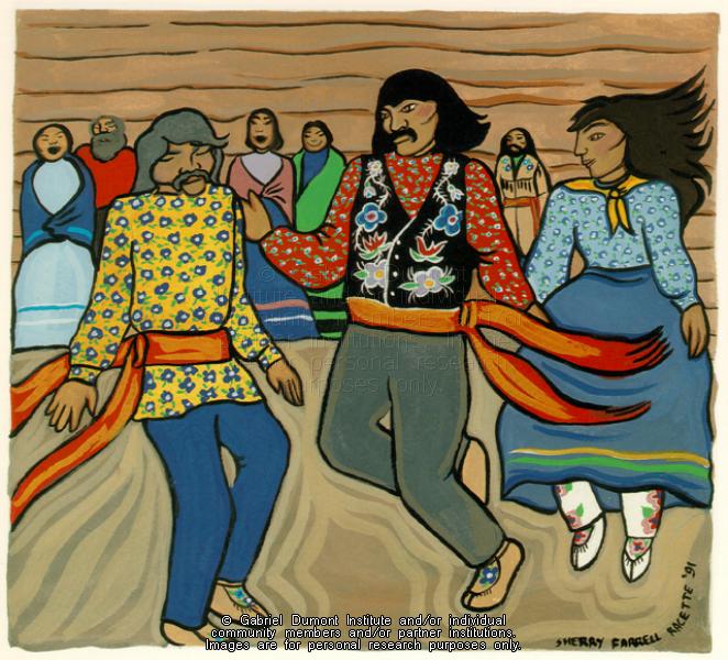 | Description: | Illustration of Métis dancers by Sherry Farell Racette for her book "The Flower Beadwork People".