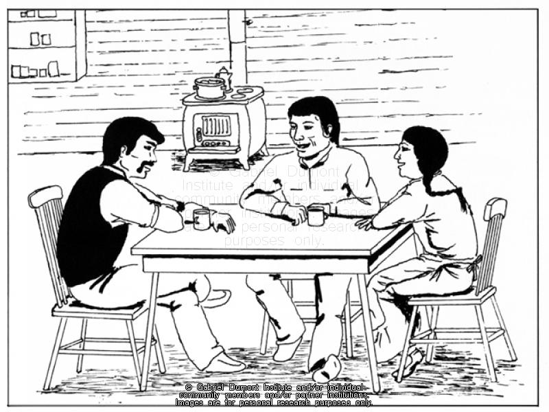 Illustration, of a Métis man asking a mother and a father for his daughter's hand in marriage, by Peter Myo for the book "A Métis Wedding". |