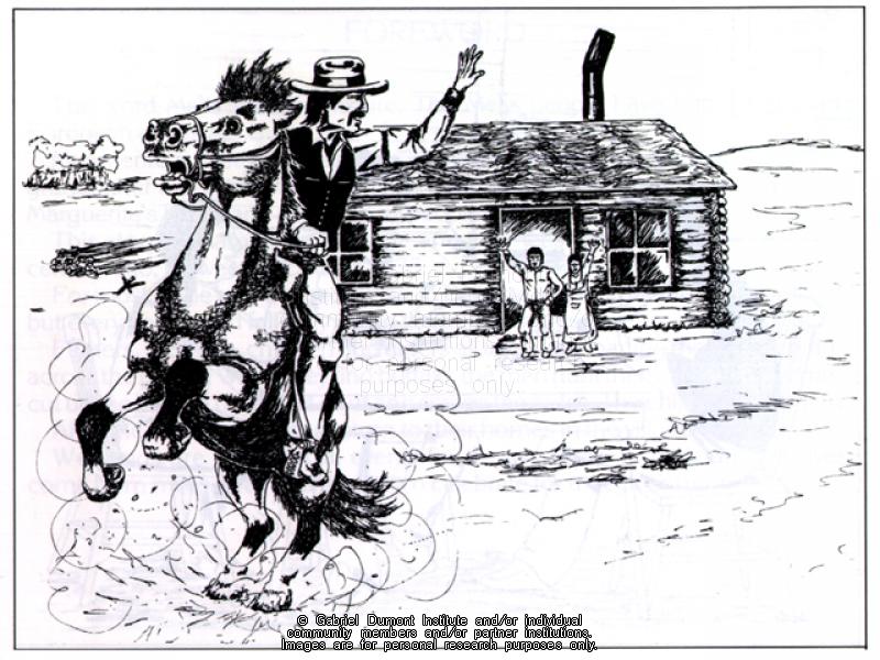 Illustration, of a Métis man leaving the cabin on a horse, by Peter Myo for the book "A Métis Wedding". |