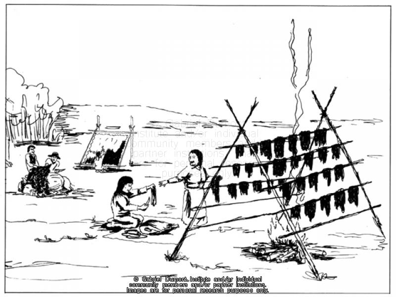 Illustration, of women cutting up buffalo meat to make pemmican, by Peter Myo for the book "A Métis Wedding". |