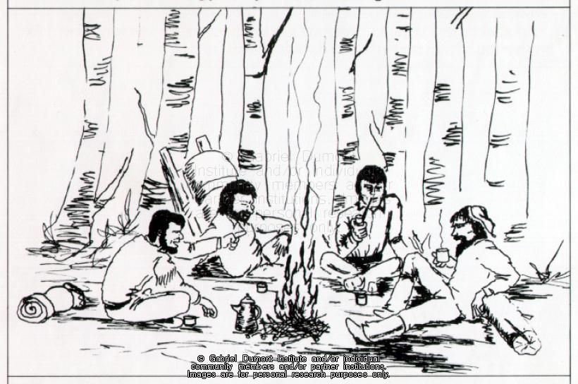 | Description: | Illustration, of voyageurs resting by campfire in the forest, by Peter Myo for the book "A Métis Wedding". |