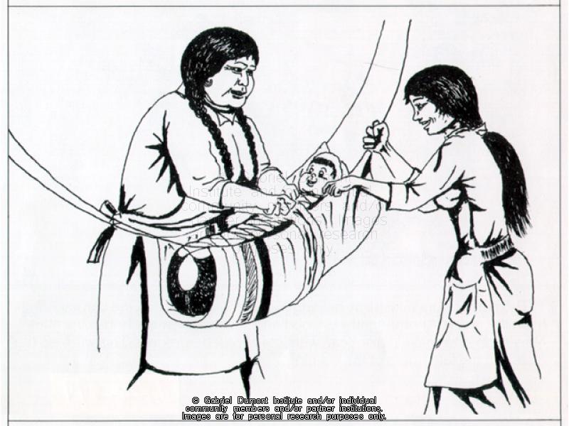 | Description: | Illustration, of women putting a baby in a hammock, by Peter Myo for the book "A Métis Wedding". |