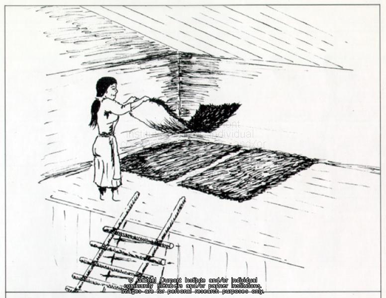 | Description: | Illustration, of a woman preparing sleeping quarters for some guests, by Peter Myo for the book "A Métis Wedding". |