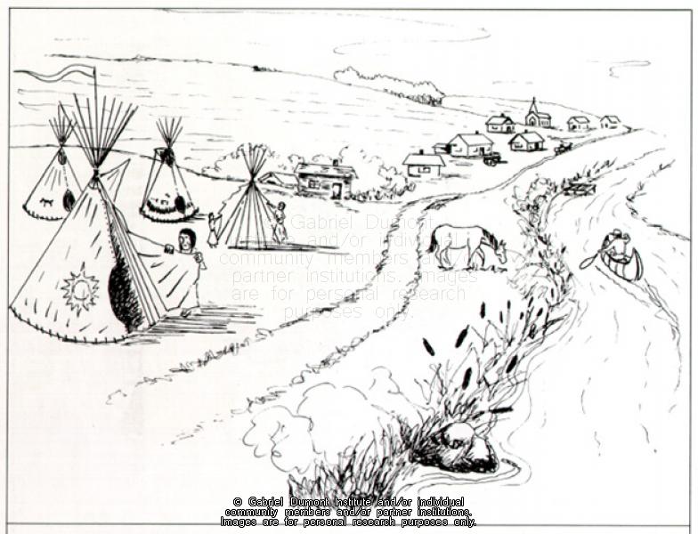 | Description: | Illustration, of Cree relatives setting up camp in yard, by Peter Myo for the book "A Métis Wedding". |