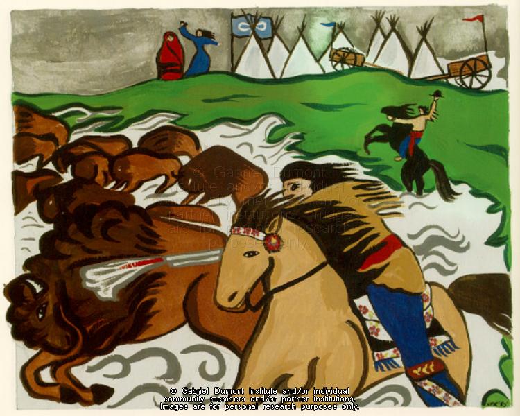 Description: Illustration, of Métis on a buffalo hunt, by Sherry Farrell Racette from her book "The Flower Beadwork People".
