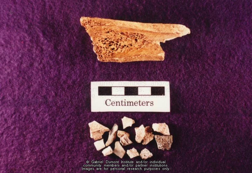 | Description: | Photograph of moose bones, from which the grease was extracted and used to make pemmican, found during a Cumberland House, Saskatchewan archaeological dig. |