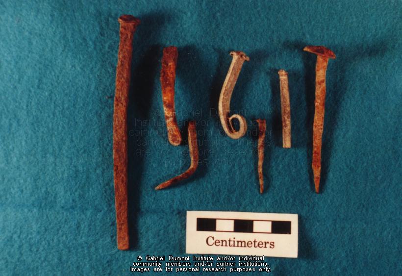 | Description: | Photograph of various nails forged by hand, used during the 18th and 19th centuries, found during a Cumberland House, Saskatchewan archaeological dig. |