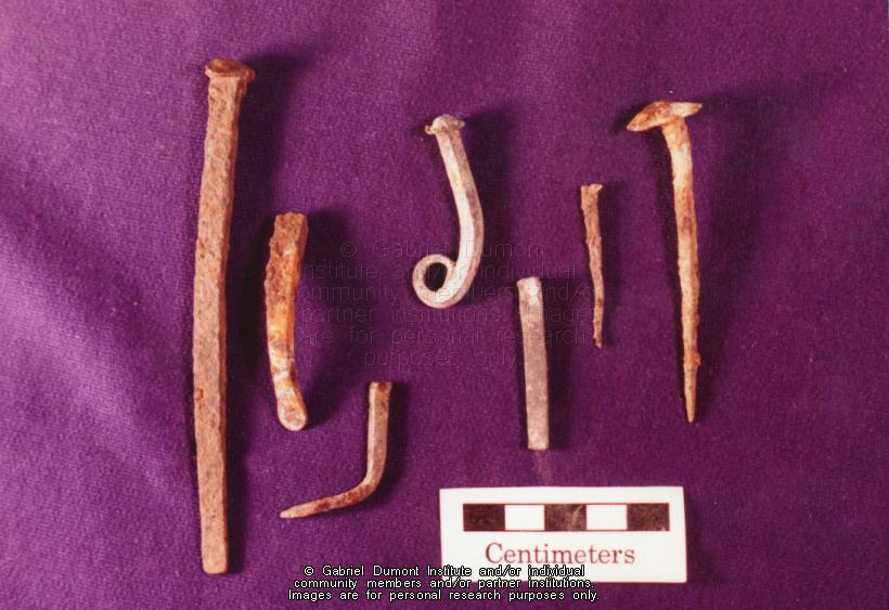 | Description: | Photograph of various nails forged by hand, used during the 18th and 19th centuries, found during a Cumberland House, Saskatchewan archaeological dig. |