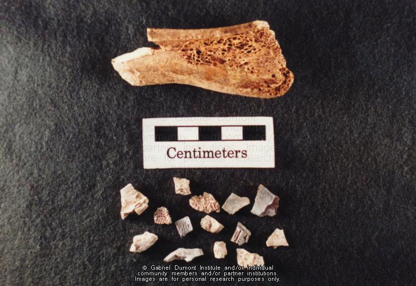 | Description: | Photograph of moose bones, from which the grease was extracted and used to make pemmican, found during a Cumberland House, Saskatchewan archaeological dig. |