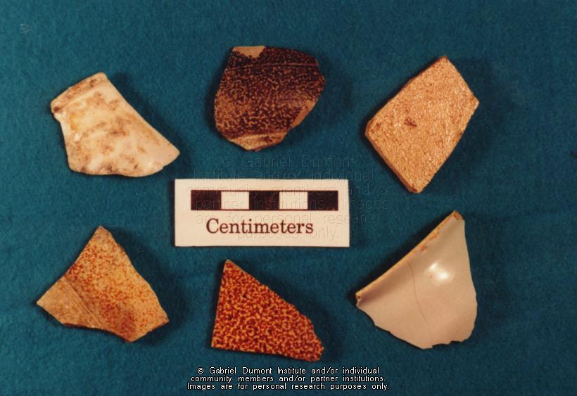 | Description: | Photograph of various plate fragments found during a Cumberland House, Saskatchewan archaeological dig. |