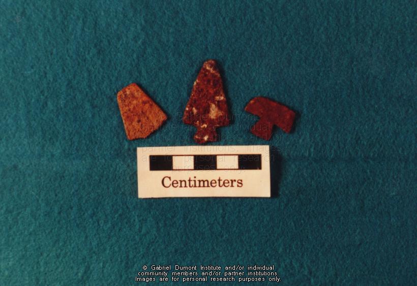 | Description: | Photograph of worked metal arrowheads found during aCumberland House, Saskatchewan archaeological dig. |