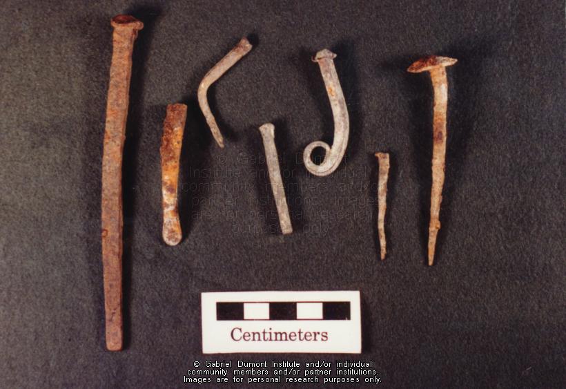 | Description: | Photograph of various nails forged by hand, used during the 18th and 19th centuries, found during a Cumberland House, Saskatchewan archaeological dig. |