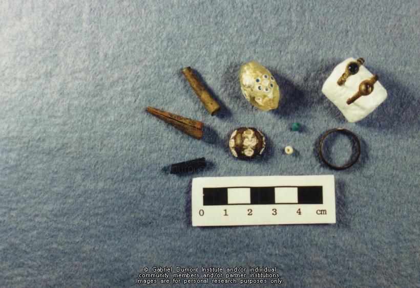| Description: | Photograph of jewelry found during a Cumberland House, Saskatchewan archaeological dig. |
