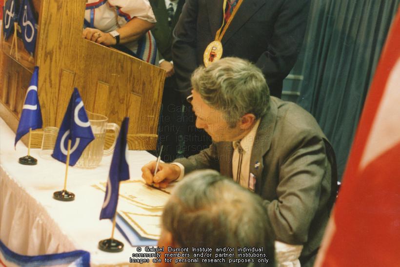| Description: | Photograph of John Boucher, Métis Elder and Senator, signing a document. |