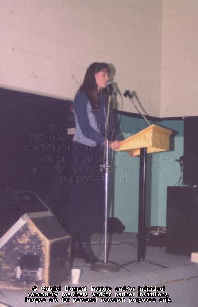 | Description: | Photograph of Leah Dorion at a podium giving a speech. |