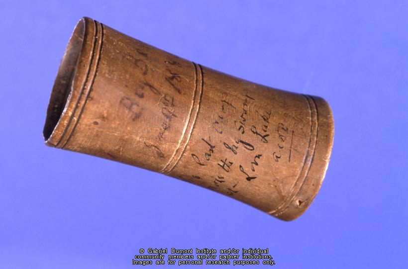 This is a photograph of a carved wooden box that was taken from Big Bear’s camp following the Battle of Loon Lake at the conclusion of the 1885 Resistance (June 1885). This artifact is part of the A.C. D. Pigott Collection, which was donated to the Gabriel Dumont Institute in October 1991 by the Pappas family of Vancouver, British Columbia. The collection includes: Louis Riel’s English-French dictionary, Lieutenant Colonel Pigott’s 1885 Resistance battlefield manuscript, and a number of artifacts taken off the battlefield including: an inscribed watch, a pipe, a bullet maker and a buffalo powder horn (both from the Métis trenches), a carved wooden container taken from Big Bear’s camp, a First Nations decorative bracelet and horsehair braiding, which may have been traded for food by the Boulton’s Scouts. |